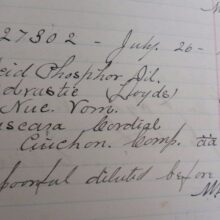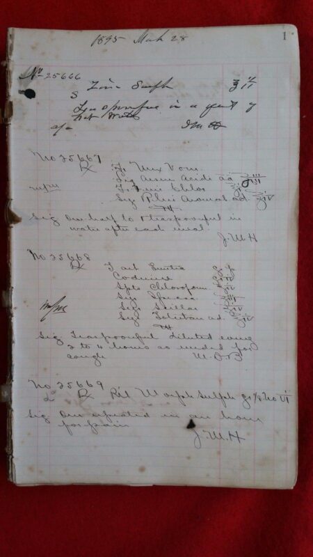 Each order was as a prescription, and was a “recipe” that came right out of the thought processes of, and reduced to writing by Dr. J.M. Hackett or his associates. (They routinely would initial their recipe after reducing one to writing in the journal.)  For his journal Dr. Hackett used a blank book with page numbers with lines and columns and after filled in, it contains more than 300 pages onto which the doctor did write more than 2800 recipe’s (ideas). The druggist would then compound each recipe for the patient to use.