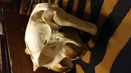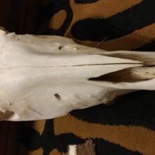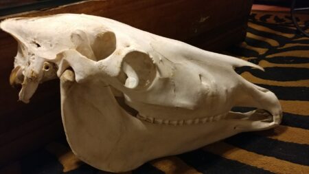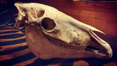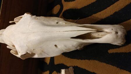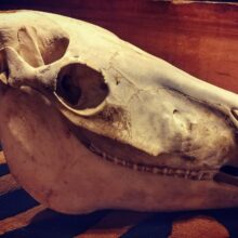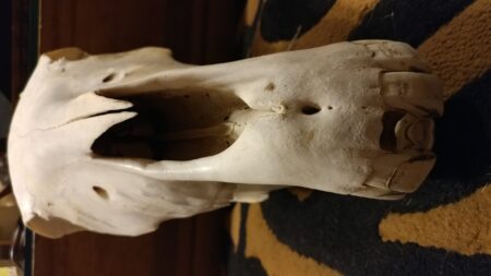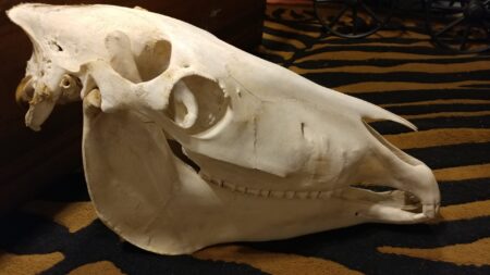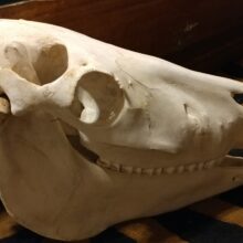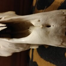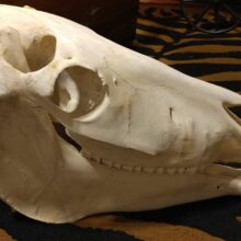 This is an incredibly well preserved taxidermy specimen of a domestic horse skull.